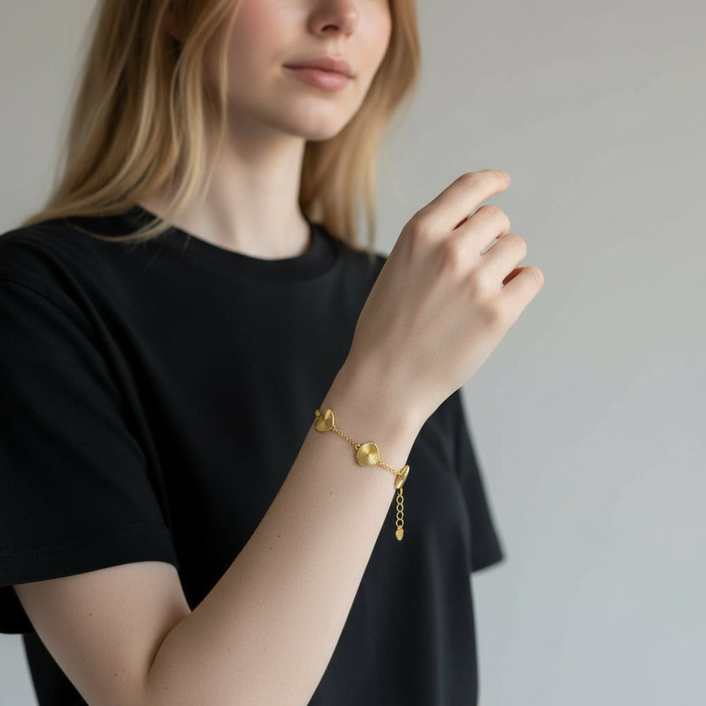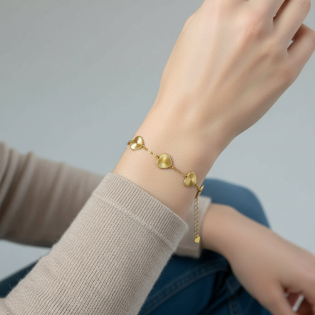 Kalplerin üzerindeki özel çizgisel doku (sunburst efekti), ışığı farklı açılardan yakalayarak taşsız da olsa göz alıcı bir parlaklık sağlar. İster sevdiklerinize anlamlı bir hediye olarak verin, ister kendi stilinize sevgi dolu bir dokunuş katın. Uzatma zinciri sayesinde her bileğe kolayca uyum sağlar.